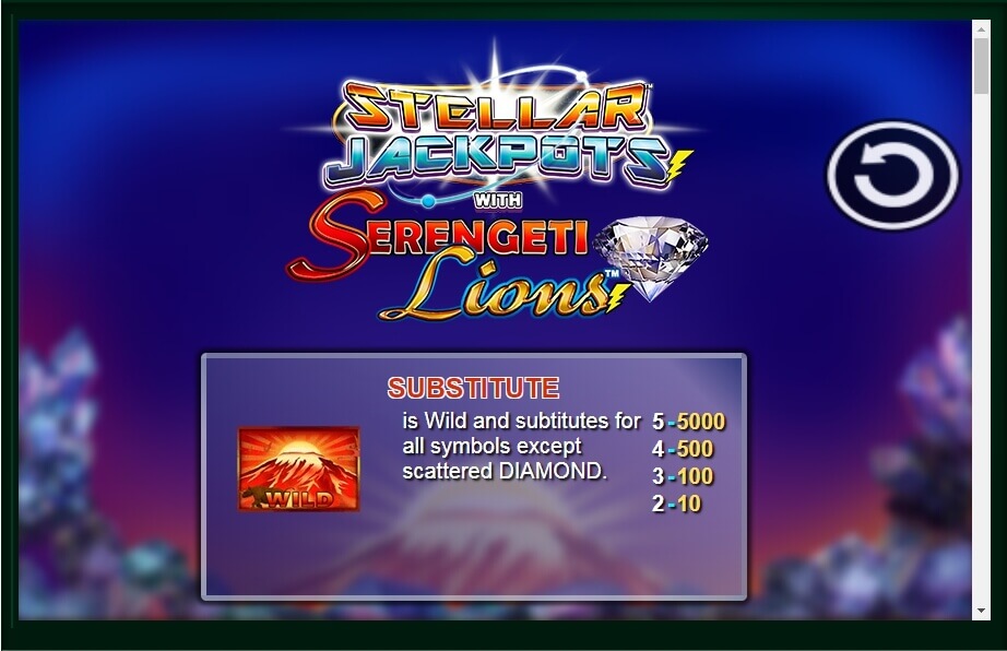 Stellar Jackpots with Serengeti Lions is a great video slot that will give to its players unforgettable feelings and emotions. During playing the game, a user will feel like a tourist who has got to wild Africa, where are some animals that will help in winning victory. An excellent graphics, high-quality and intuitive interface is a key to a successful game in this slot.