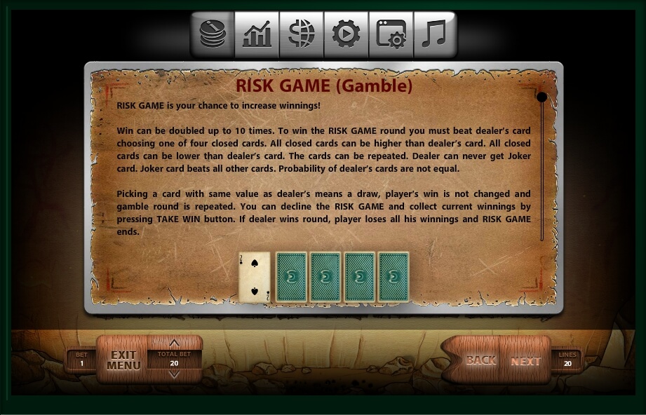 It also activates the so-called Gambling mode. It is a bonus round, where you can either double your winning or lose everything. The mini-game contains 5 cards, one with its face up. You need to pick another card, and if it is bigger than the one that is already on the table, your winning is doubled. If it is smaller, you lose.