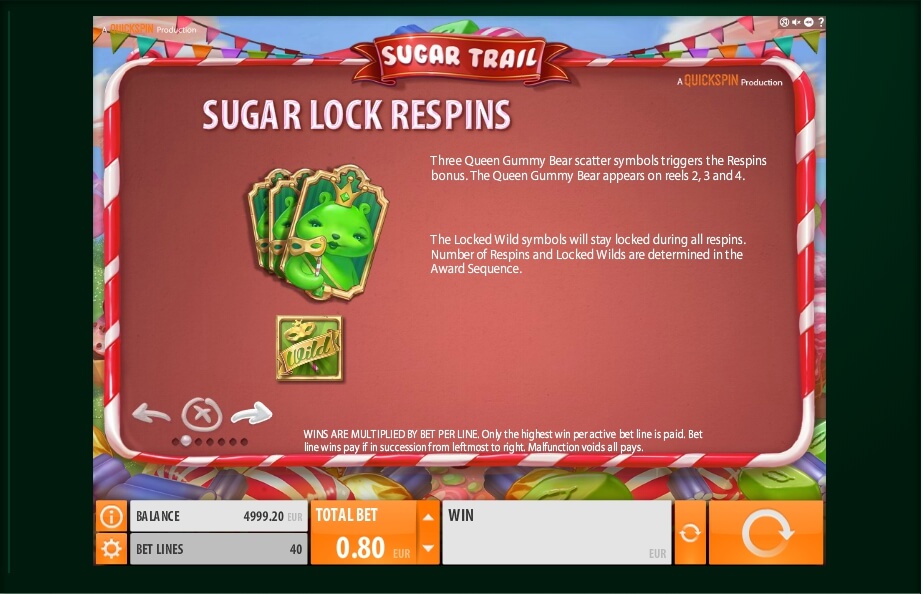 The Sugar Trail slot is quite simple to manage. To force sugar bears and candies to create sweet winning lines, the gambler ought to push an orange key with a swirling arrow. An orange small square with the letter “I” will allow the gambler to get acquainted with the rules of the slot, the variety of combinations of all forty winning pay-lines, as well as terms for receiving payouts and bonus programs.
