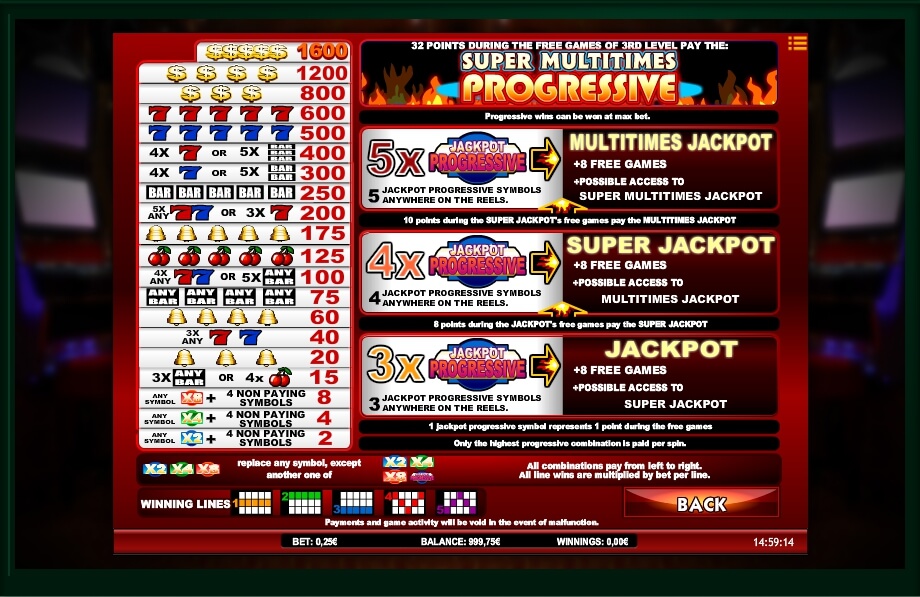 The appearance of the slot, namely the frame of the steel color, resembles a mechanical apparatus. The playing field consists of five reels and five prize lines. As in the classic version, in the Super Multitimes Progressive video slot the paytable is directly on the screen. It indicates possible combinations and sizes of prize money. Since a progressive jackpot is played in the model, the scoreboard is located in the center, where its account is maintained. The central part is occupied by drums. Near the first one are the numbers of paylines.