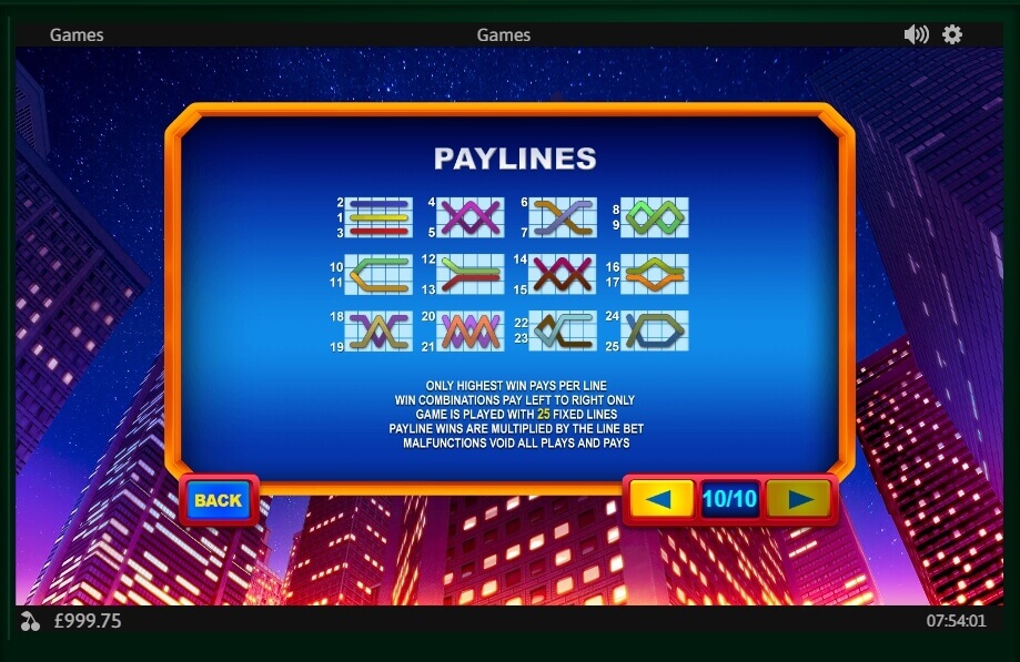To start the game, you need to place a bet that varies from 0.01 to 1.00. Then click on Spin and you are in the game. The slot machine has 5 x 3 reels and 25 winlines. The lines number is unchangeable. There is no registration and no download on our site, so make yourself comfortable and play the casino game.