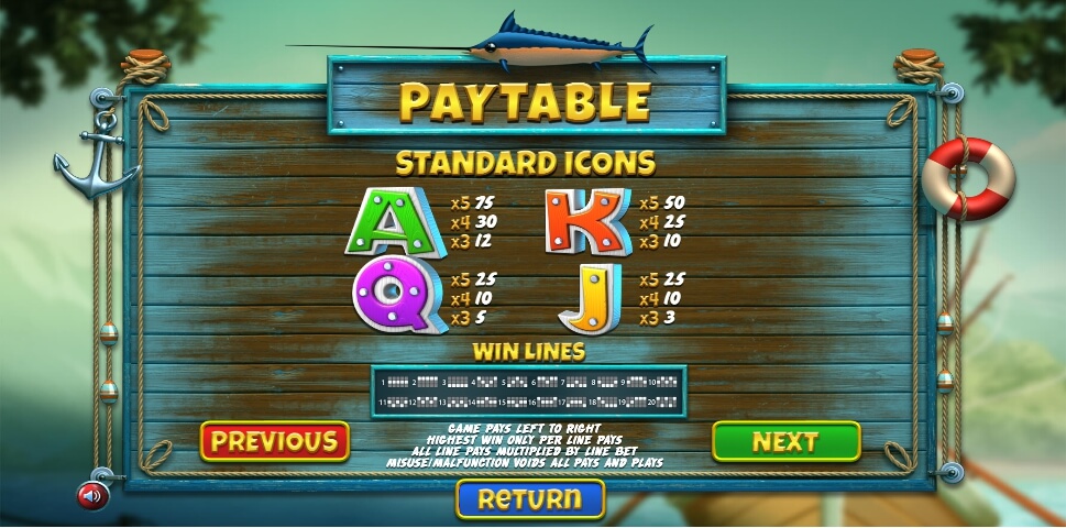 The main character will report a good catch with joyous bouncing, and at this time the wheel will appear on the drums, on which the user’s winnings will be determined. Quiet and optimistic music creates an atmospheric mood. The gameplay is characterized by the presence of standard options, which makes it easier for the player to learn the basic functions of the slot. The control panel is located below the reels. To determine the number of game lines, you must use the “Select Lines” option. “Bet per line” will help you to choose the number of credits per line, and in the “Choose coin” section with the + and – buttons you can select their value. If you want to play with the maximum values, then you need to use “Max Bet”. Next to it is the green Spin button, which is responsible for launching the reels.Also, there is an automatic game mode. The Autoplay option is responsible for its activation.
