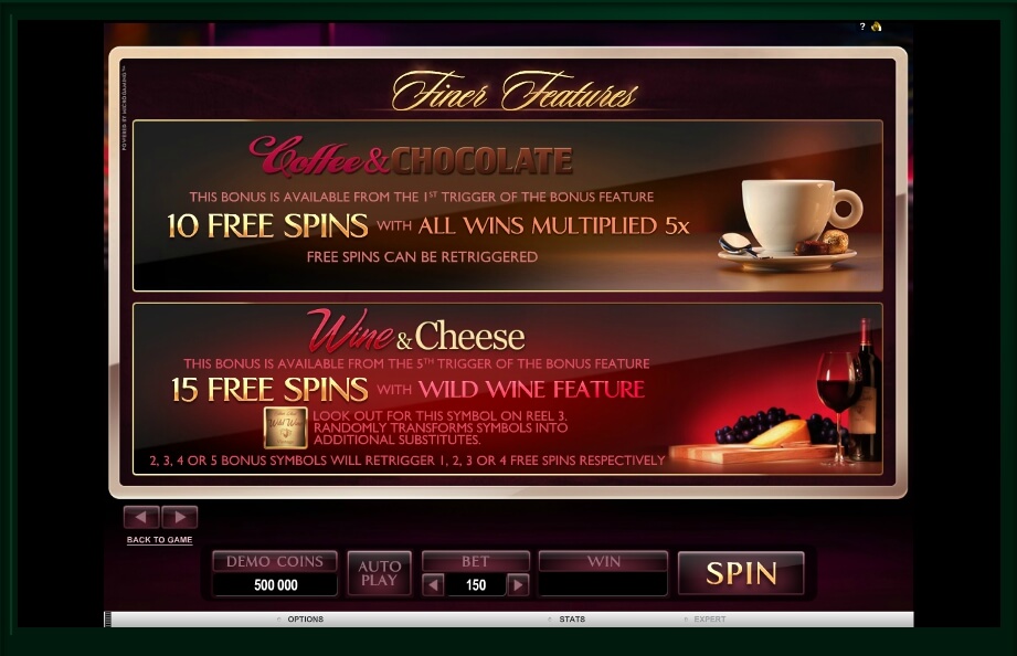 The well-known manufacturer the Microgaming has created a very high-quality and attractive gaming «mechanism» called The Finer Reels of Life. It should immediately be noted that this device is designed for fans of everything exquisite and refined. While playing this video slot, the user can relax and be at ease, because the entire created atmosphere will make you feel cozy and warm. The graphical images of this online-game fully meets the theme, and it offers the participant to visit a romantic evening, in the company of loved ones.
