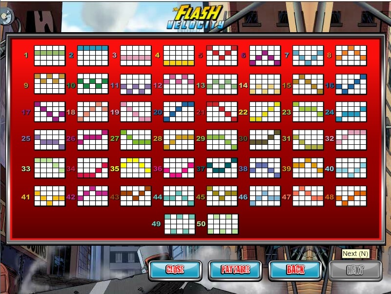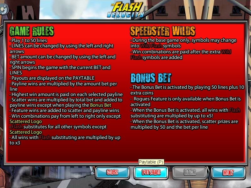 The Flash: Velocity casino slot has 5 reels and 50 active lines. The number of coins is fixed: you can put only one for each line. However, the range of rates is impressive, varying from 1 to 2 dollars, which will please both beginners and experienced players. Jackpot in the game is equal to 10,000 coins, and the payback rate of the slot is very pleasant, reaching 95.5%, which is a pleasant indicator of the Nextgen video slots.