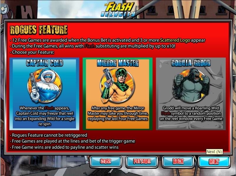 Scatter and bonus symbols are represented by a lightning bolt with the inscriptions Scatter and Bonus, respectively. They have a standard set of functions. The Flash opponents also have their own characteristics: Captain Cold can hold the rotation of one or more reels, turning all the symbols on them into Wild; Gorilla Grodd can move Wild to any position on the screen during the bonus spins, and the Mirror Master allows the player to travel in time and replays the last 4 spins.