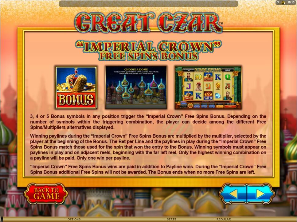 The highest paying symbol is Czar Peter is paid for 500 coins for 5 of a kind. It can come stacked on all reels, providing more and better chances to make some nice wins here. The ‘Imperial Crown’ Free Spins game is triggered if you manage to collect 3 or more Scatters.Before playing the Free Spins game, you need to choose the number of free spins and its multiplier. Choose from 30 free spins with x1 multiplier, 15 free spins with x2 multiplier, 5 free spins with x6 multiplier, or 2 free spins with an x15 multiplier.