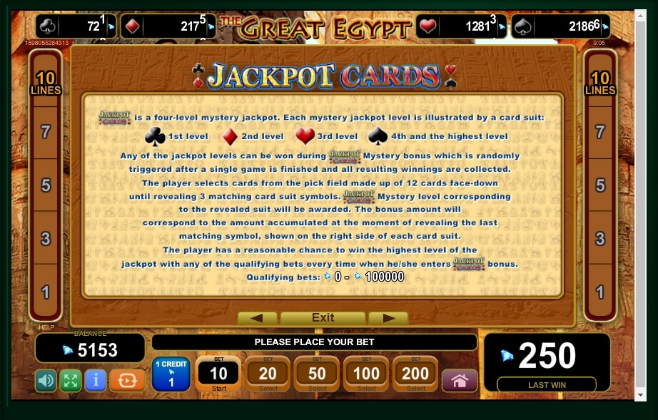 “Great Egypt” represents 5 reels and 10 game lines. Payment occurs if 3, 4, 5 identical images are added to one of them. Each user of the online game participates in a draw of a jackpot, the main prize of which reaches 10 thousands credits. In addition, a gamer can increase each of winnings with the help of a risk-round, which is started by the “gamble” button. Here you have to guess a colour of a card. In case of victory, the sum is doubled. Money can be immediately taken away, or you can continue to guess up to 5 times.