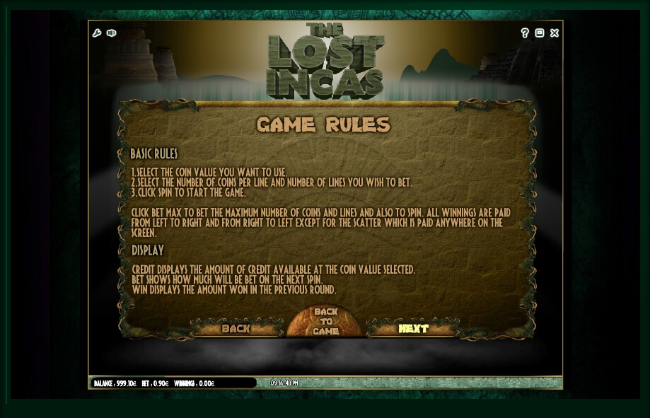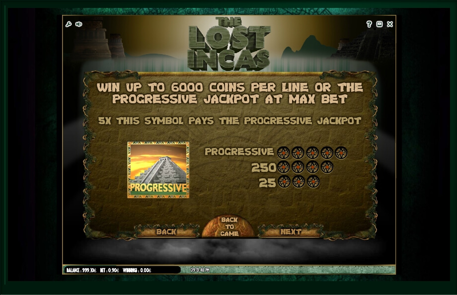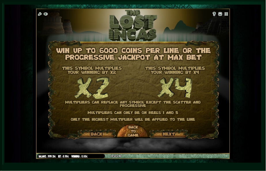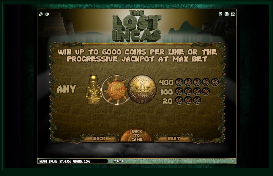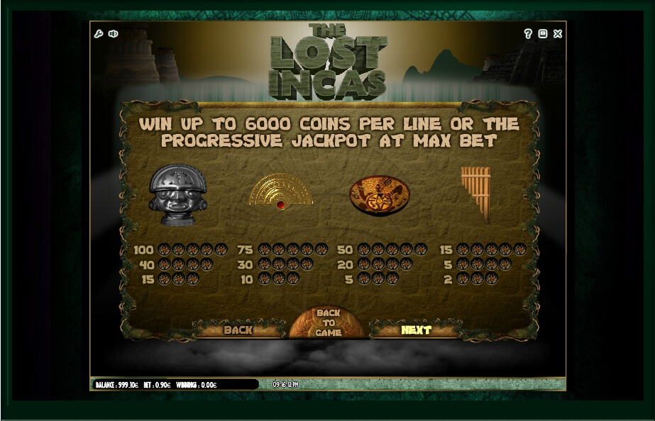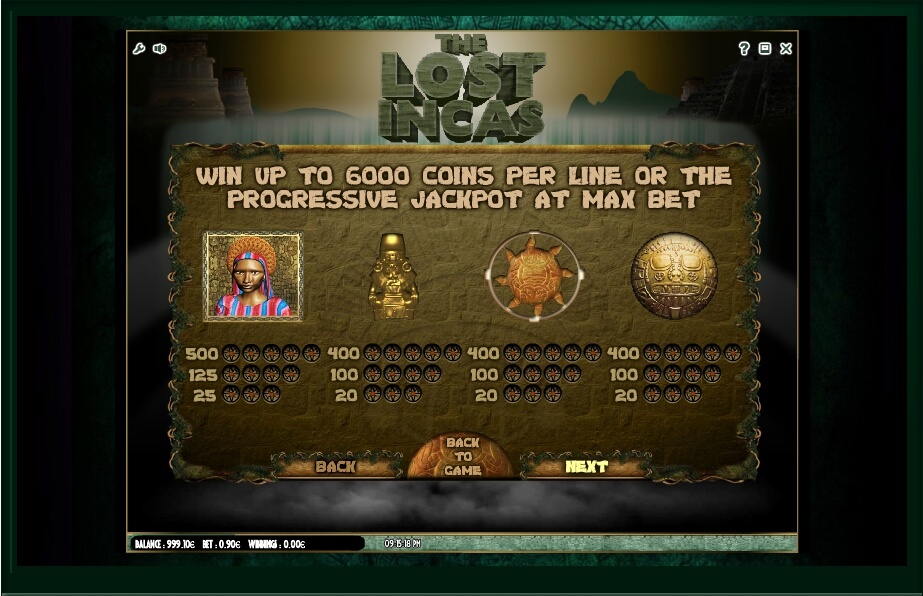 The Lost Incas is a five-reel videoslot with 9 paylines and an arrangement of pictures on the screen in three rows. The user can play Lost Incas on any number of lines, up to 9. The bet on the line can be up to ten coins, and their denomination is determined by the user. It can be done thanks to the coins button and the adjacent lines button, which helps to set the number of active lines. What is also worth noting is the auto play option, this you will understand when you want to just enjoy the game, and then the abovementioned option will spin the reels instead of you.