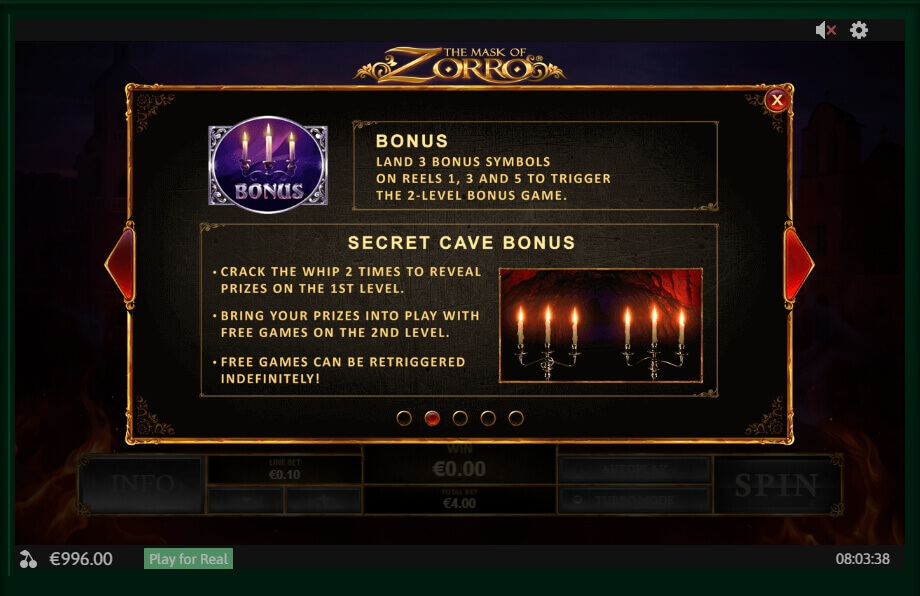Zorro is one of the characteristics of the gambling. The Wild icon not only replaces symbols. Zorro uses his epee to make the famous Zorro sign on any reel and turn other icons into Wild. The hero may add from 4 to 10 Wild icons. There is a bonus round that is happened in the secret cave. The player will see 2 candlesticks with 3 candles in each.