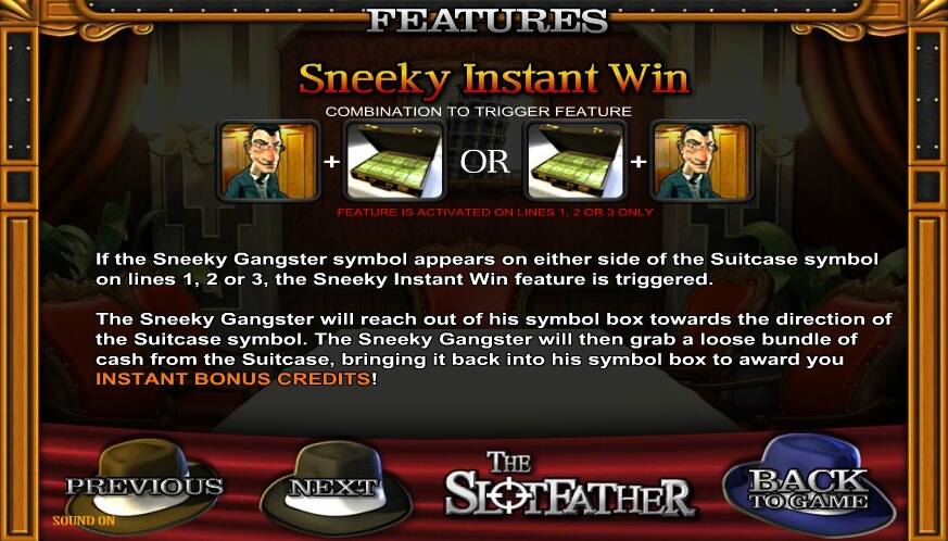 Hitting the jackpot is not the only way to win in the Slotfather slot machine game. While there are no wild symbols here, there are scatter symbols and four bonus features in this game. For instance, there is an instant win feature that is activated whenever the Sneaky Guy appears next to the Suitcase symbol.