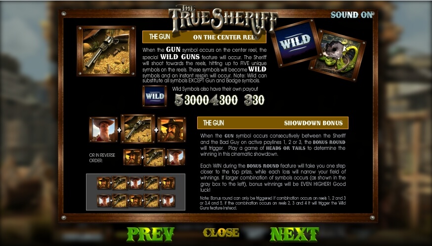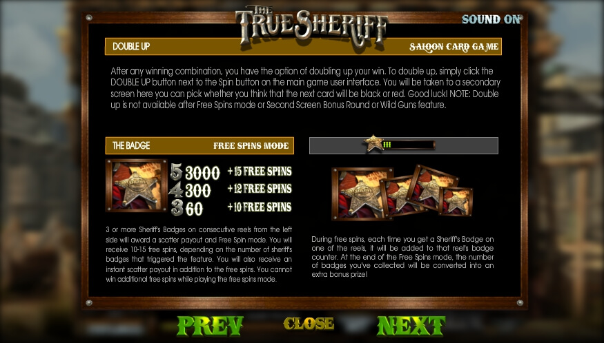 There are many ways to win in the True Sheriff slot game. One of the features is known as Double Up. It always appears in game after a winning sequence hit the screen. A player then is offered to take chances and try to double the amount of coins. The free spins feature in this game is activated when 3 or more badges are on the pay lines. The number of spins, as well as the size of the multiplier and the final prize, depends on how many badges are on the screen. It is also possible to get the Instant Prize feature while the free spins are active. The maximum number of free spins is 15. There is a Wild symbol, the Gun, in this game, and there are two ways to win with it. First, if the gun appears next to the sheriff, the shooting begins and up to 5 symbols turn to Wilds, allowing a player to re-spin the reels. Second, if the gun is between the sheriff and the bandit, another bonus round is activated. It is a duel between the sheriff and the bad guy. The more heads are shot down, the bigger the final winning is, and there can be many levels in this mini game.
