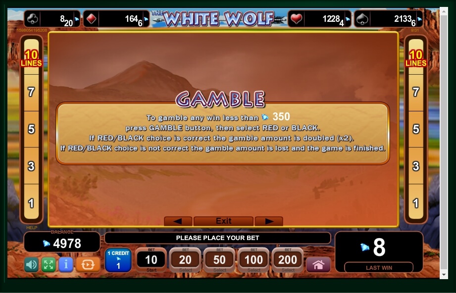 In the centre you will find buttons with figures 10,20,50,100,200: these are the betting options that a user can activate. The bet amount is removed from the player’s balance, and an information on the current balance can be seen on a special scoreboard. The same scoreboard displays a data on the amount won.
