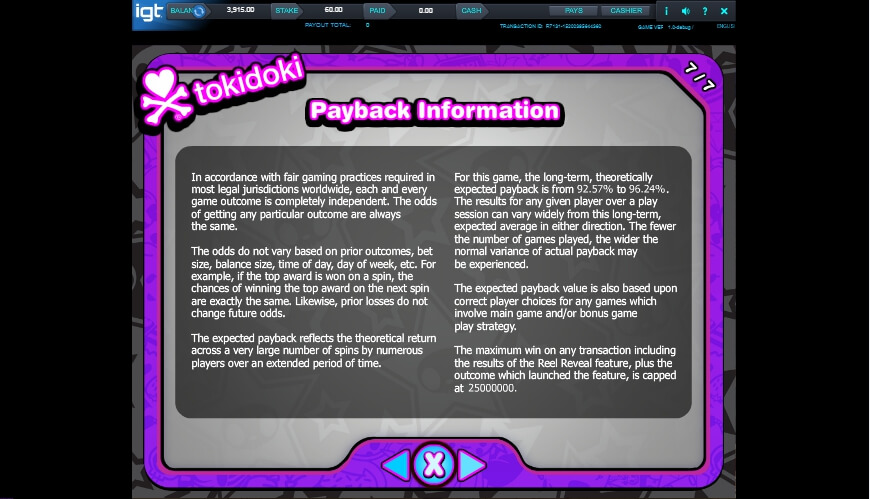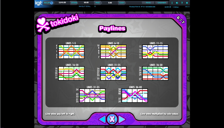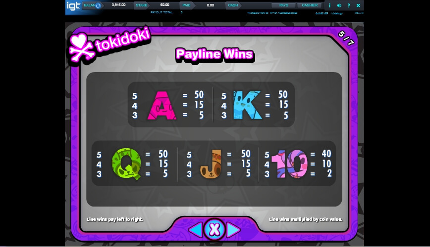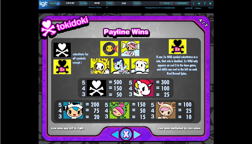 The interface of the slot machine is rather simple and convenient. It is not overloaded with a lot of useless information and buttons. Under reels, there is a control bar on which your current balance, the bet size per line and the general bet, as well as your benefit for the last round are displayed. All remaining is placed in the information menu. The slot of Tokidoki Lucky Town consists of five reels on which 15 symbols at the same time appear. Using them, you also should collect prize-winning combinations on 40 lines of payments to receive a prize. The range of rates is quite wide that considerably expands the game opportunities. So the minimum rate on a round will cost you 60 cents and if you want to play to the maximum, then be ready to bet up to $600. If it is possible to regulate the bet size, then the number of active lines is fixed and it is impossible to change them. As the producer of the slot states, the percent of payments makes 96,5% that is a very good indicator.
