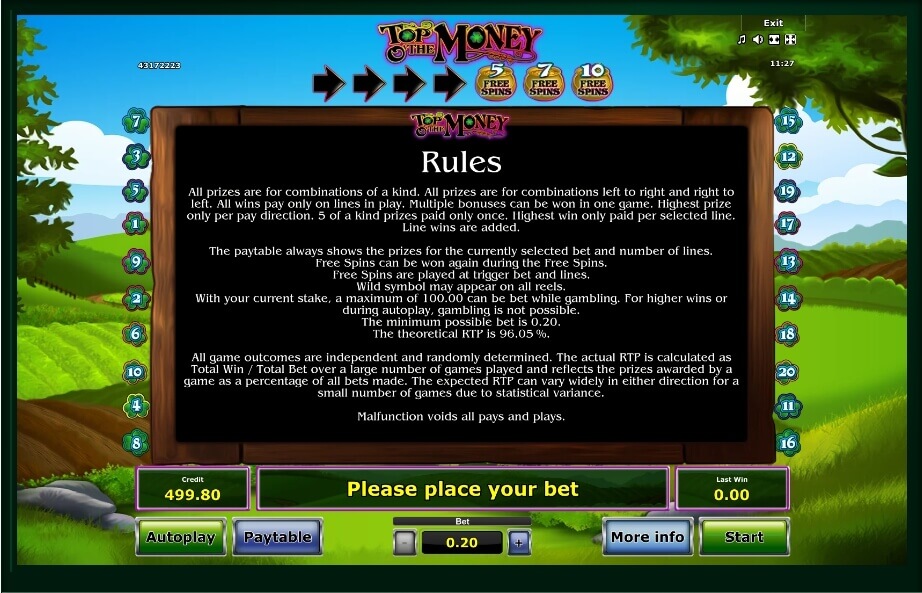 The game provides for simple user settings that will allow you to adjust the sound and screen settings. These settings are in the upper right corner. The basic parameters are found in the “Menu” section. All 20 lines are active by default. For this reason, the participant only needs to make a bet using the “Bet” button.