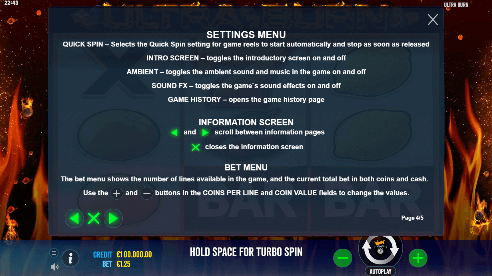 Visually, Ultra Burn sticks to bright fruit icons framed by flames. The animations are clean but minimal, matching its classic inspiration. While the sound effects fit a traditional slot, the absence of background music made the experience feel incomplete.