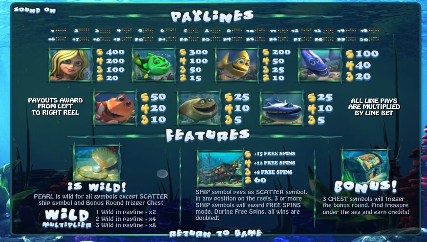 The Under the Sea gambling has a lot of bonuses to be collected by the gamer. To find them, collect the matching fishes or mermaids on the paying table. Then you will get a chance to see some winning combinations. For one slot, you will get a two-time multiplier, for two four time and for three – eight time. Don’t forget about the bonus round. To open it, find three ships or spin the reel for two times. Then you will need to find some treasures with a bonus chest on paying line.