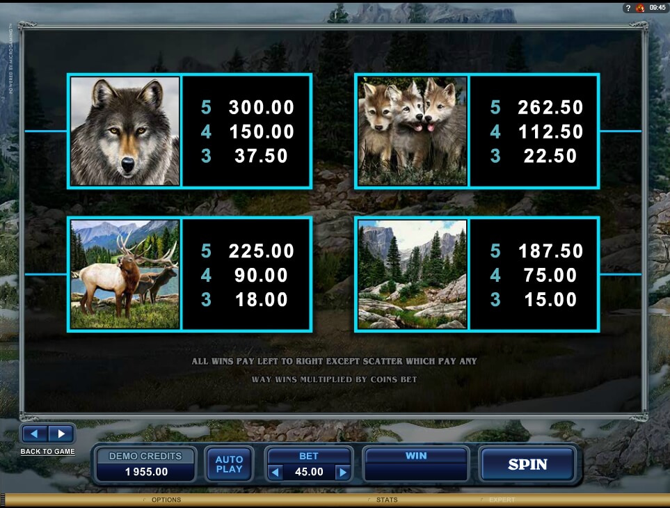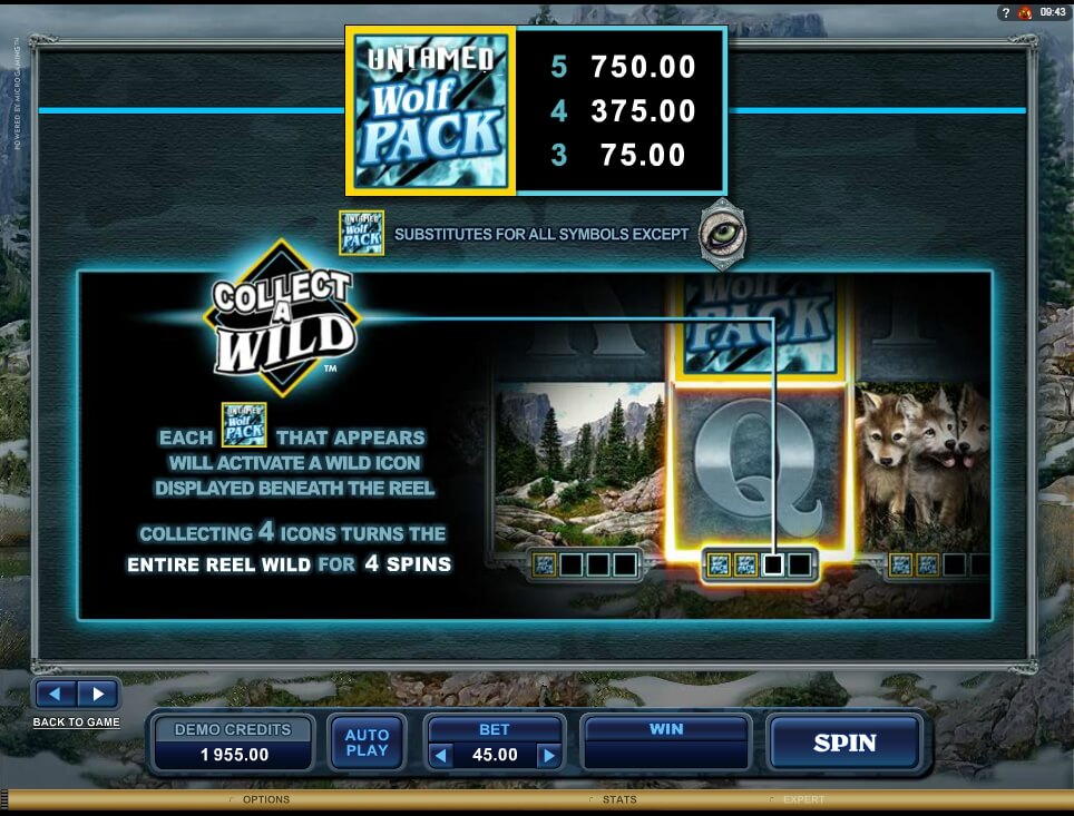Like in all normal games, you can’t start playing the Untamed Wolf Pack gambling without managing the configurations of your account. To do them, use a special panel beneath the gaming reel. In the center of the screen you will see the “Bet” tab. It gives you a chance to manage the amount of money that you can put at stake on every line of the gaming reel.