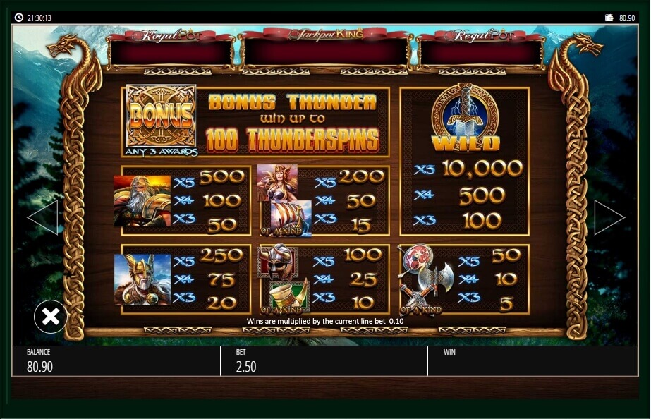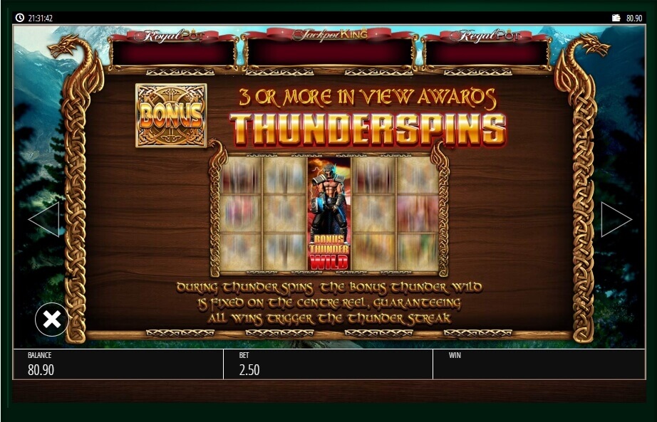 The second special symbol is called “Thunder Streak Wild” and it appears only on 3 reels and occupies the entire strip. An additional round is called “Bonus Thunder”.