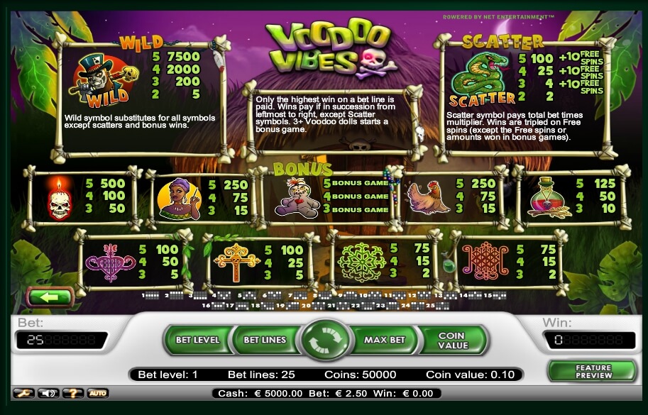 The Voodoo Vibes video slot has 5 reels and 25 active lines. On one active line, you can put from 1 to 4 coins with a denomination from 1 to 50 cents. The maximum possible win in the game is 7500 coins, and the payback rate of the slot is very pleasant – 94%, which is a high indicator for NetEnt video slots.