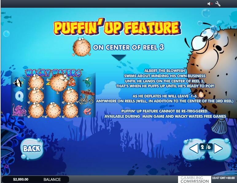 In Wacky Waters, the control panel is intuitively clear and concise – all in the tradition of Playtech. In the left corner is Info, which is necessary for studying the rules of the game, the properties of symbols and their coefficients. She opens 6 pages of the necessary information. The Line button simply indicates the number of lines – 15, because you can not switch them in Nutty waters. But the Lie Bet button is active, it helps to establish a linear bet. It is noteworthy that there is no version of Bet Max.