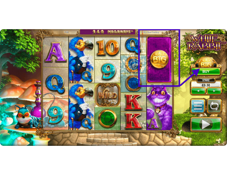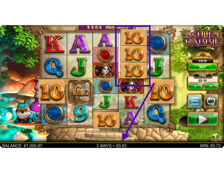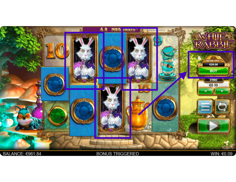 Players can purchase free spins in White Rabbit for x100 of the selected bet. However, this cost can be reduced. Coins periodically appear on the reels and fill the Feature Drop meter. With each collected coin, the price of the bonus decreases until the player can activate the feature completely free of charge.