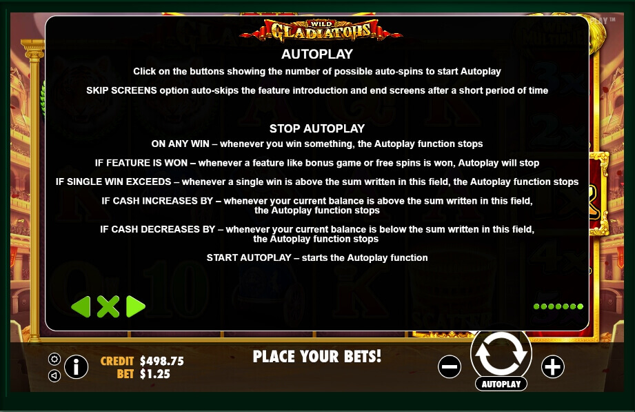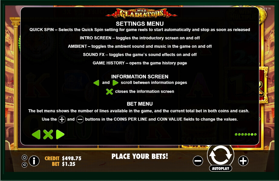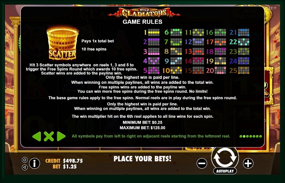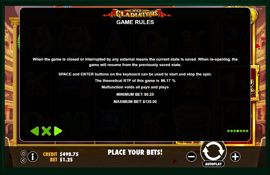 According to the traditions of Pragmatic Play, there are no unnecessary buttons here. Each key allows you to fully control the gameplay and its performance. First, the client needs to visit the theoretical section that opens with the “i” button. The first page contains a description of special characters, then you will find the structure of the lines and also the game rules.