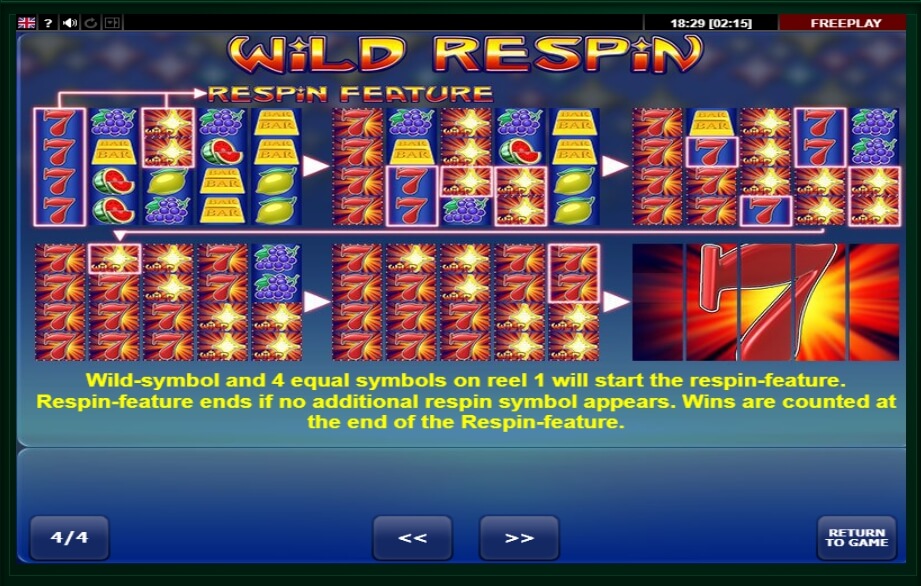The core of the game is definitely the respin-feature. Land the Wild symbol and 4 equal symbols on reel 1 to start it. Respin-feature will continue its validity until no additional respin symbol appears. The wins are counted at the end of the respin feature.