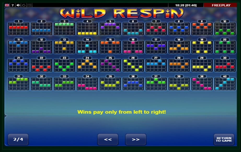 The payout table contains three pages: the 1st page contains information about possible winnings according to the size of the bet and the value of the combination; the second one describes the Resin function with an example; the third line represents the game lines, where the combinations can be formed.