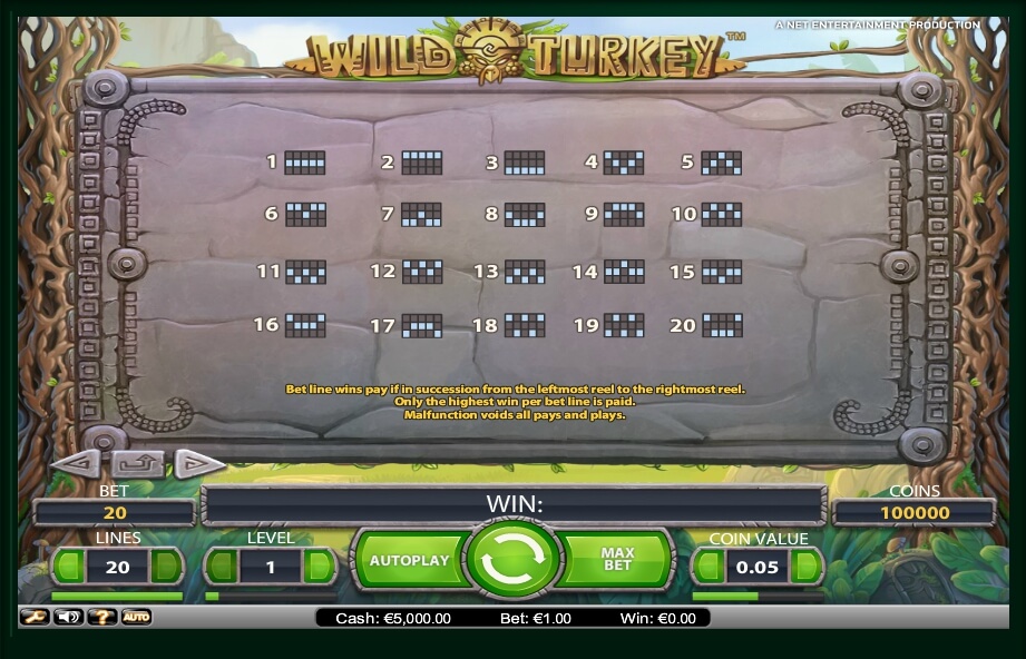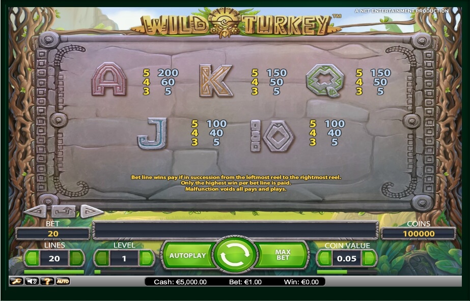 The Wild Turkey slot machine has 5 reels and 20 active lines. Game symbols can form combinations not only in a straight line, but also diagonally, or in a column. The wager in the game is from 1 to 10 coins per line, and the range of rates is from 1 to 50 cents. The jackpot in the game is equal to 4,000 denominations of coins, and the payback rate of the slot is very pleasant – 96.6%, which is a stable indicator for NetEnt!