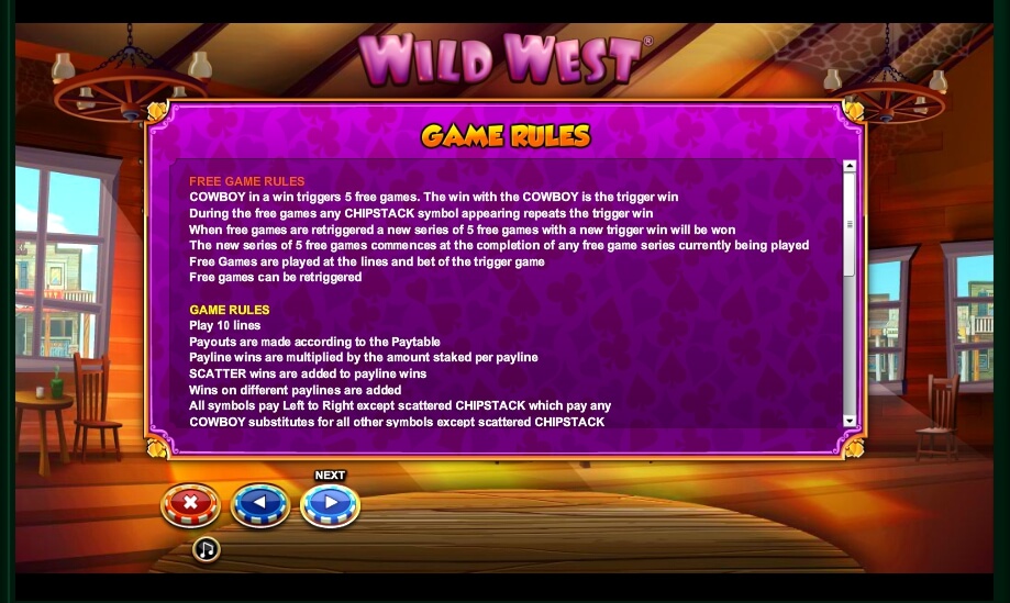 When the Cowboy is in a win, 5 Free Games are activated. Re-triggered Free Games are played after the first round ends. Each Chipstack symbol that appears awards the Chip Prize. The main jackpot here is 1000 coins.