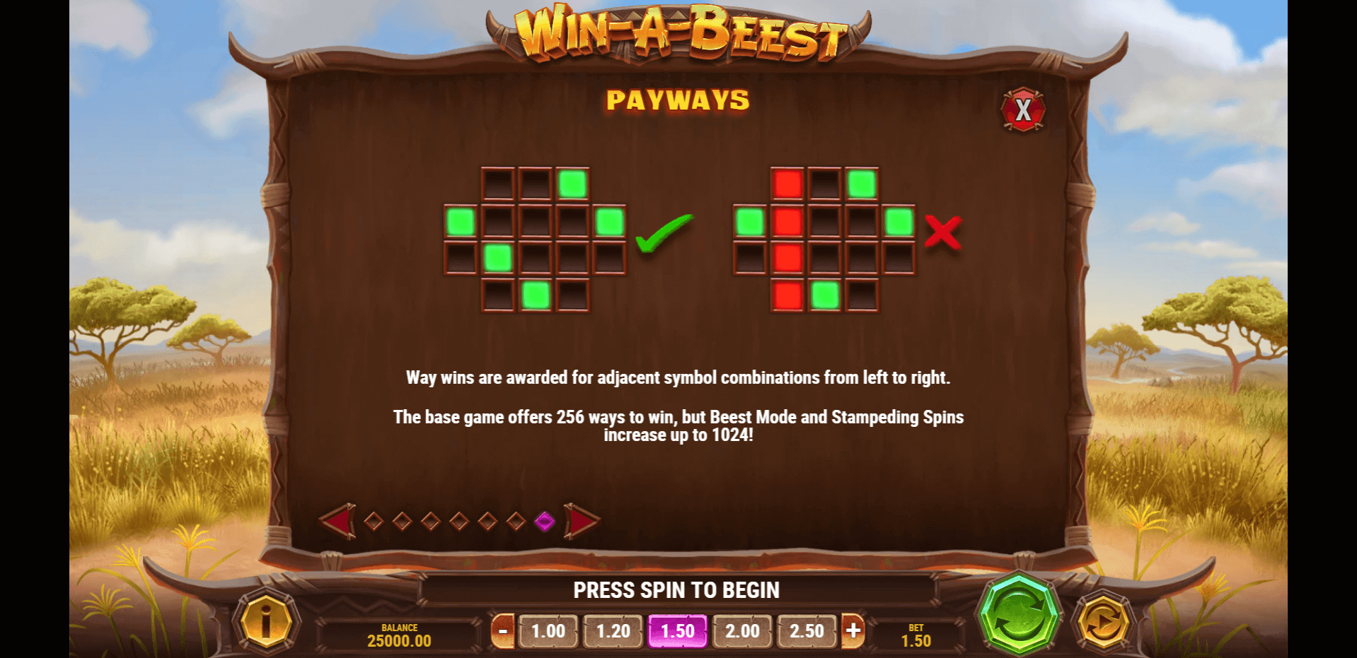 Most spins played on the 2-4-4-4-2 layout with 256 ways, but Beest Mode expanded the grid to 5x4 and 1,024 ways, letting stacked Beest symbols connect across more reels. Stampeding Spins locked that wider grid for several turns, so strings of high‑pay hits were much easier to land. Regular Wilds did their job filling gaps, and the overall flow stayed quick.