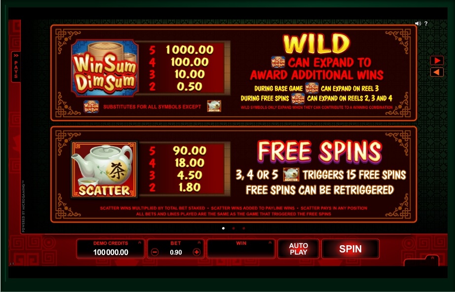 During the regular games, the wild card can expand on reel 3 and during the Free Spin round the wild card can expand on reels 2, 3 and 4. A jackpot of 100 coins will be awarded once 5 Win Sum Dim Sum wilds emerge on the reels.