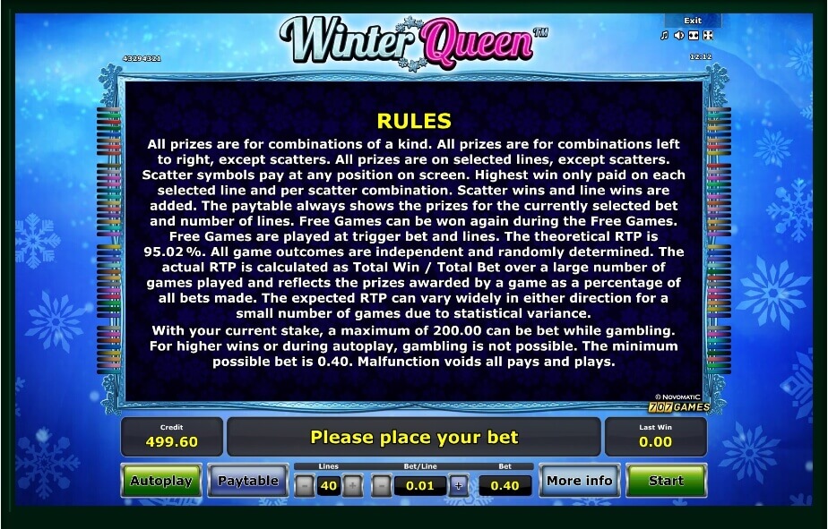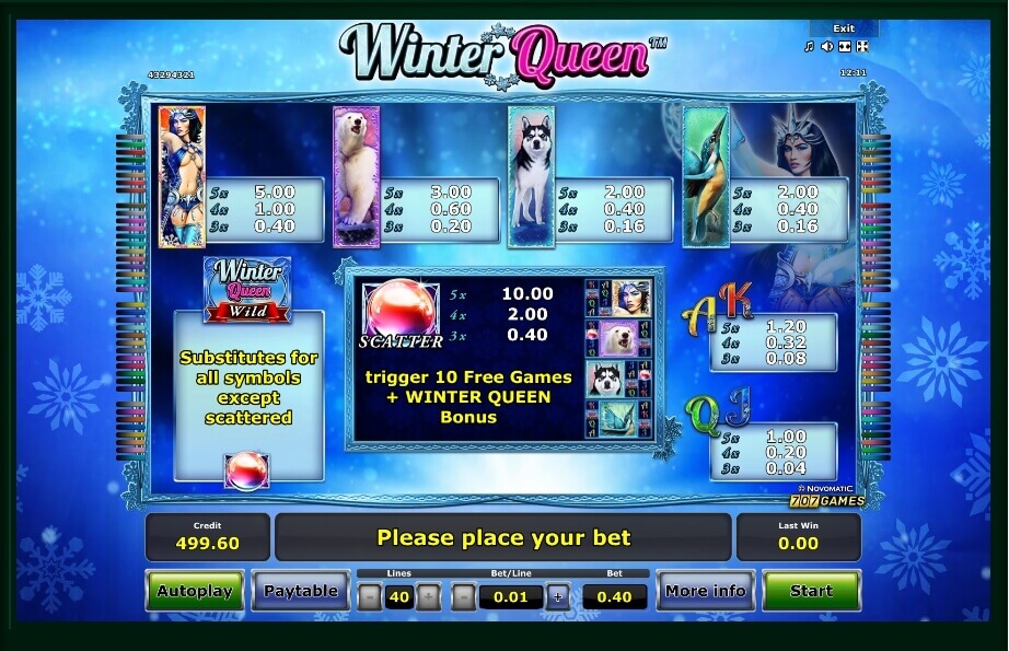 The slot machine attracts attention with its bright design and exotic plot. The beautiful graphics, animation and colorful music immerses in the cold world. “Winter Queen” also features a convenient interface and additional offers that make the gameplay diverse.