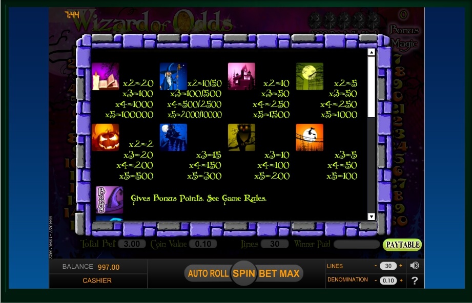 To win big in the Wizard of Odds, collect similar items within the same row. Use standard slots from left to right and you will trigger a bonus hat mini-game with a lot of potential prizes. One of them if free spin. It gives an opportunity to increase your winning score a couple of times. If you will land five matching symbols on the paying line – be prepared to jackpot mini-game.