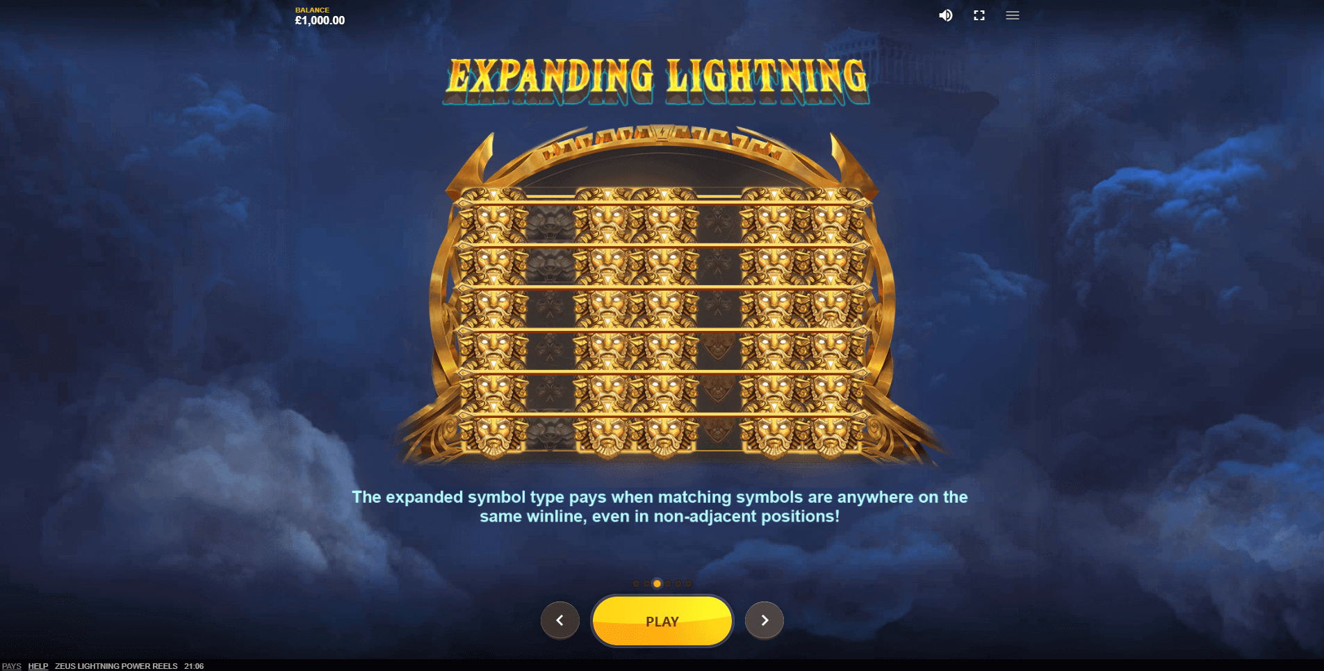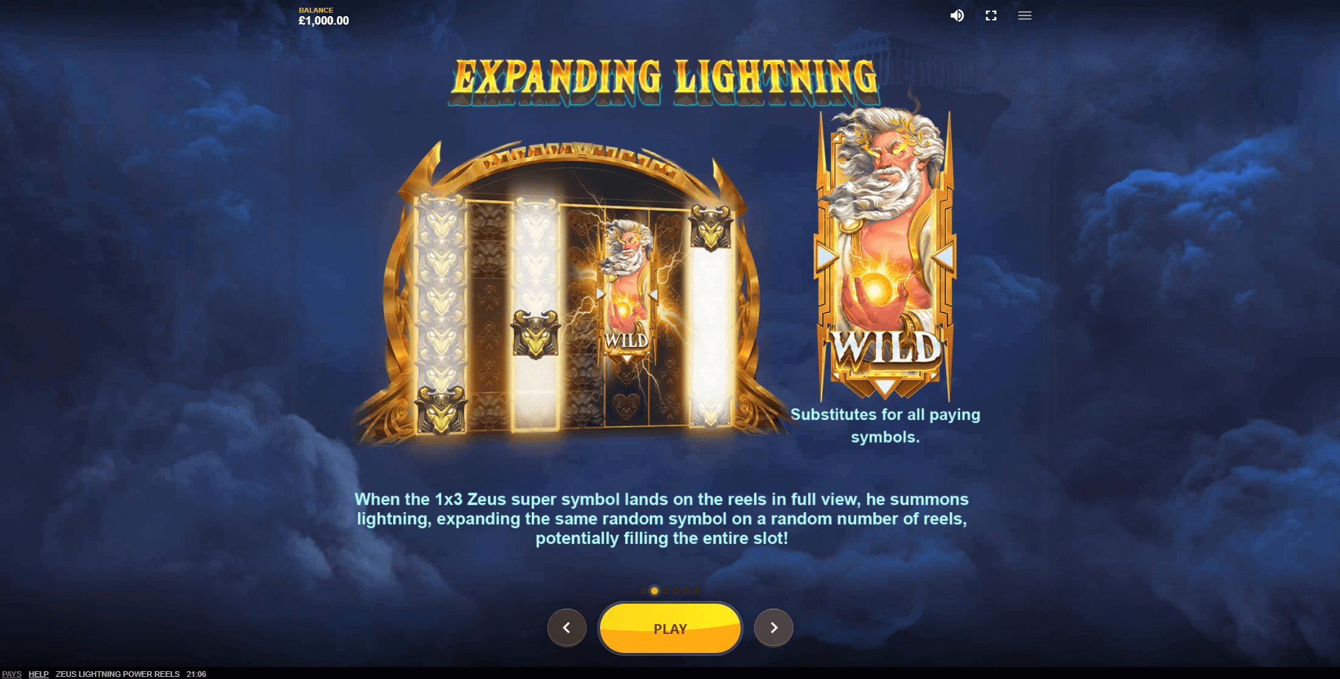 Expanding Lightning. When a Zeus Wild lands on the reels, he strikes multiple reels with lightning. Those reels then fill top to bottom with matching symbols. The number of affected reels is random — in some cases, nearly the entire grid can be covered. If at least three reels are filled with Expanding Lightning symbols, the player receives a payout across all 30 paylines. What’s more, the win is awarded even if the filled reels aren’t adjacent.