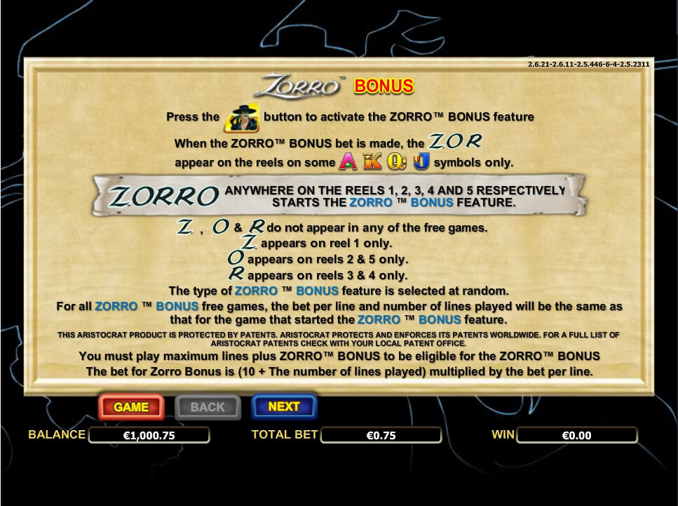In the each door you could meet a characters: Juliana, Zorro and the villain. The bonus credits: for Zorro – 1000 credits, Juliana – 750 credits and for the villain Monastario – 500 credits.